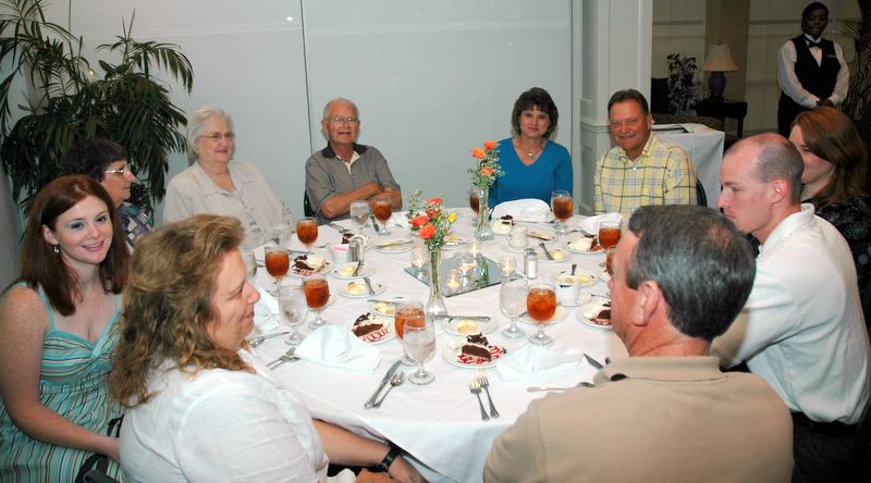 CMH 80th Birthday Party -- Lynns & Hutchens mixing. George, Evelyn, Macie, Ann, Wilma, James, Donna, Jimmy, Christy & Dustin.