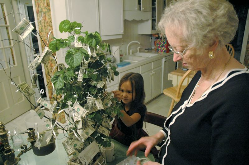 CMH 80th Birthday Party -- Helen and Grandmother picking fruit of the money tree, one of several nice gifts.
